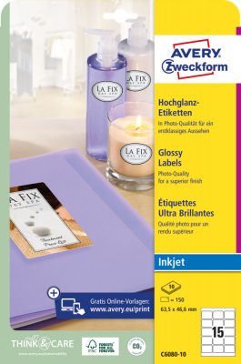 • Avery Zweckform No. C6080-10 tintasugaras 63,5 x 46,6 mm méretű, fehér színű, fényes felületű, fotóminőségű termékcímke A4-es íven - 150 címke / csomag - 10 ív / csomag (Avery C6080-10)