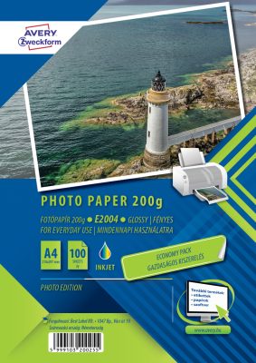Avery Zweckform A4-es méretű (210 x 297 mm) 200 g-os, fehér színű, fényes felületű, egyik oldalán 5760 dpi maximális felbontással tintasugaras nyomtatóval nyomtatható, gazdaságos kiszerelésű papír.