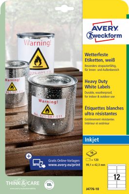 • Avery Zweckform No. J4776-10 fehér színű 99,1 x 42,3 mm méretű, tintasugaras nyomtatóval nyomtatható, öntapadós időjárásálló etikett címke, erős, tartós ragasztóval A4-es íven - 120 címke / 10 ív