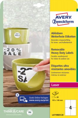 Avery Zweckform No. L4719REV-20 fehér színű 105 x 148 mm méretű, lézernyomtatóval nyomtatható, öntapadós időjárásálló etikett címke, visszaszedhető ragasztóval A4-es íven - 80 címke / 20 ív