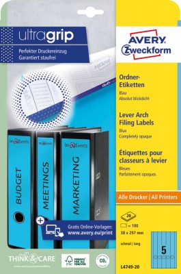 • Avery Zweckform No. L4749-20 kék színű 38 x 297 mm méretű, univerzálisan nyomtatható, öntapadós iratrendező címke, permanens ragasztóval A4-es íven - kiszerelés: 100 címke / 20 ív
