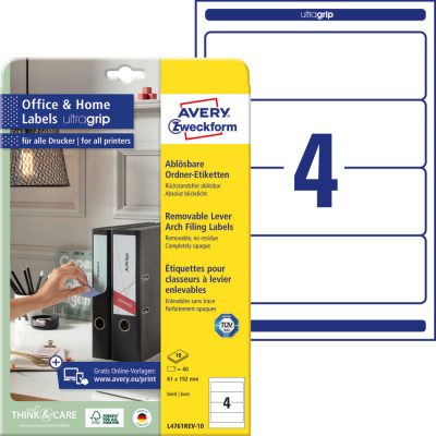 • Avery Zweckform No. L4761REV-10 fehér színű 192 x 61 mm méretű, univerzálisan nyomtatható, öntapadós iratrendező címke, visszaszedhető ragasztóval A4-es íven - kiszerelés: 40 címke / 10 ív