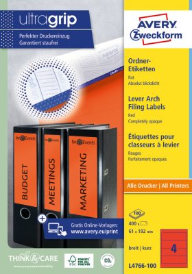 • Avery Zweckform No. L4766-100 piros színű 192 x 61 mm méretű, univerzálisan nyomtatható, öntapadós iratrendező címke, permanens ragasztóval A4-es íven - kiszerelés: 400 címke / 100 ív
