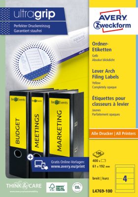 Avery Zweckform No. L4769-100 sárga színű 192 x 61 mm méretű, univerzálisan nyomtatható, öntapadós iratrendező címke, permanens ragasztóval A4-es íven - kiszerelés: 400 címke / 100 ív