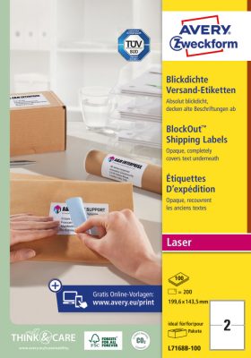 • Avery Zweckform No. L7168B-100 fehér színű 199,6 x 143,5 mm méretű, nagy fedőképességű, lézernyomtatóval nyomtatható, öntapadós etikett címke, permanens ragasztóval A4-es íven - 200 címke / 100 ív