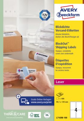 • Avery Zweckform No. L7169B-100 fehér színű 99,1 x 139 mm méretű, nagy fedőképességű, lézernyomtatóval nyomtatható, öntapadós etikett címke, permanens ragasztóval A4-es íven - 400 címke / 100 ív