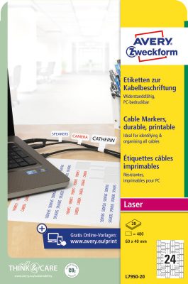 • Avery Zweckform No. L7950-20 fehér színű 60 x 40 mm méretű, lézernyomtatóval nyomtatható, öntapadós kábeljelölő címke, erős, tartós ragasztóval A4-es íven - kiszerelés: 480 címke / 20 ív
