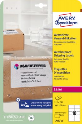 • Avery Zweckform No. L7992-25 fehér 99,1 x 57 mm méretű, lézernyomtatóval nyomtatható, időjárásálló öntapadós etikett címke, permanens ragasztóval A4-es íven - kiszerelés: 250 címke / 25 ív