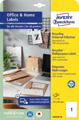 Avery Zweckform No. LR3478-10 natúr fehér színű 210 x 297 mm méretű, univerzálisan nyomtatható, környezetbarát öntapadós etikett címke, permanens ragasztóval A4-es íven - kiszerelés: 10 címke / 10 ív