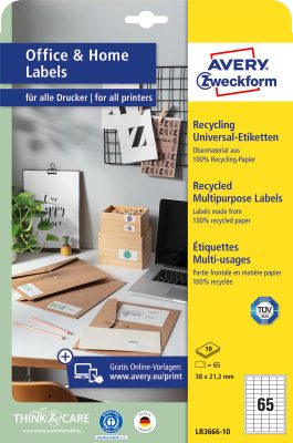 Avery Zweckform No. LR3666-10 natúr fehér színű 38 x 21,2 mm méretű, univerzálisan nyomtatható, környezetbarát öntapadós etikett címke, permanens ragasztóval A4-es íven - kiszerelés: 650 címke / 10 ív