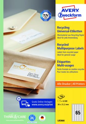 Avery Zweckform No. LR3666 natúr fehér színű 38 x 21,2 mm méretű, univerzálisan nyomtatható, környezetbarát öntapadós etikett címke, permanens ragasztóval A4-es íven - kiszerelés: 6500 címke / 100 ív