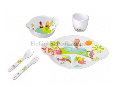 - Színes, mintás szett. - 1 db tálka - 1 db osztott lapos tányér- 1 db bögre - 1 db kanál- 1db villa