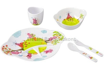 - Színes, mintás szett. - 1 db tálka - 1 db osztott lapos tányér- 1 db bögre - 1 db kanál- 1db villa