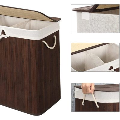 osztott szennyes kosár fedéllel, bambusz mosodai akadály 2 részes, kivehető bélések, pamut fogantyúk, 100 literes tárolókapacitás, mosókonyhához, hálószoba, barna