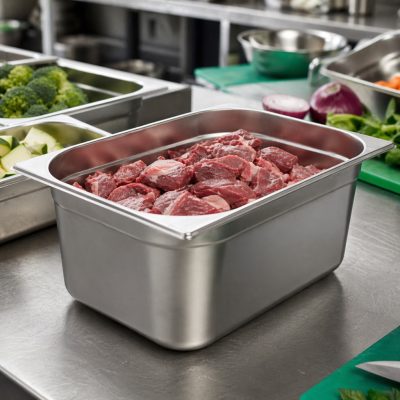A GN 1/2 méretű, 150 mm mély rozsdamentes edény a gastronorm rendszer nagy kapacitású eleme, amelyet kifejezetten nagy mennyiségű ételek tárolására és kezelésére terveztek.