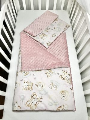 Bbaby 2 részes egybevarrt babaágynemű – Állatbarát Álom, rózsaszín és púder minky, állatmintás pamutvászon