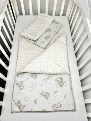 A kollekció további elemei – 3 részes ágynemű, pólya és babafészek – egységes, nyugodt hangulatot teremtenek a babaszobában