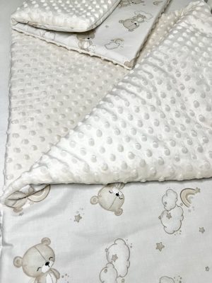 Egyik oldala bézs pöttyös textúrájú minky, mely melegséget és komfortot nyújt, másik oldala 100% OEKO-TEX pamutvászon, aranyos mackókkal, felhőkkel és szivárványokkal díszítve.