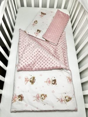Bbaby 2 részes egybevarrt babaágynemű – Púdertánc minky, balerinás pamutvászon