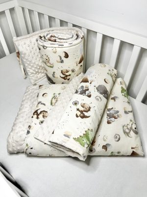 A mintákon megjelenő barátságos dínók, teknősök és erdei elemek játékosan díszítik a kiságyat, miközben megnyugtató, földszínű hangulatot árasztanak.