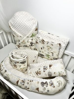 A Dínó Bézs Minky szett tökéletesen illik a kollekció többi tagjához – babafészekhez, kókuszpólyához és pelenkázólaphoz –, hogy teljes, harmonikus babavilágot teremts.