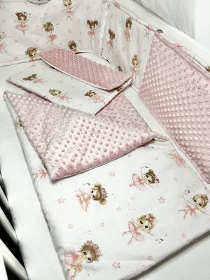 • Bbaby 3 részes egybevarrt babaágynemű – Púdertánc minky, balerinás pamutvászon és egyenes fejvédő