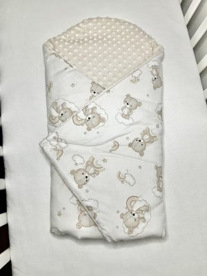 A bézs pöttyös minky oldal selymes tapintású, megnyugtató melegséget ad, míg a 100% OEKO-TEX pamutvászon oldal kedves mackós, szivárványos és felhős mintákkal díszített — az álomvilág és a szeretet szimbólumai.