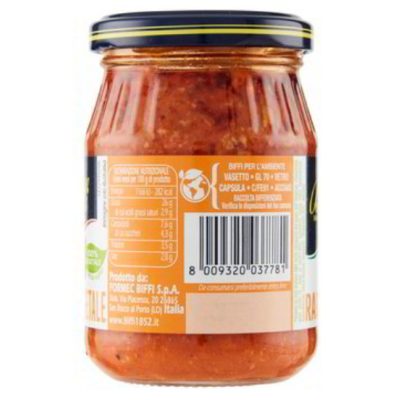 Biffi szója ragu, 190, Átlagos tápérték 100g termékben: Energia: 1166 kJ/282 kcal, Zsír: 26g, ebből telített zsírsavak: 2,9g, Szénhidrát: 7,6g, ebből cukrok: 4,3g, Fehérjék: 3,5g, Só: 2,8 g, Összetevők: paradicsomszósz 32%,napraforgóolaj,sárgarépa,hagyma,zeller,extra szűz olivaolaj, textúrált szója 5%, paradicsom koncentrátum 4%,só,cukorkeményítő,bazsalikom,módosított kukoricakeményítő,rozmaring,fekete bors,savanyúságot szabályozó növényi tejsav. Mogyorót és diót tartalmazhat. Minőségét megőrzi a csomagoláson feltüntetett időpontig. Hűvös, száraz helyen tárolandó. Származási ország: Olaszország. Forgalmazó: Milis Faplusz Kft., 8092 Pátka, Gárdonyi u. 36