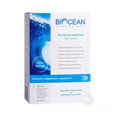 IZOTÓNIÁS plazma, 0,9 %-os óceánvíz, 30×10 ml ampulla. A BIOCEAN® Izotóniás óceánvíz prémium minőségű készítmény. Előállítása gyógyszergyártó laboratóriumban történik, René Quinton (1866-1926) francia biológus felfedezése nyomán.