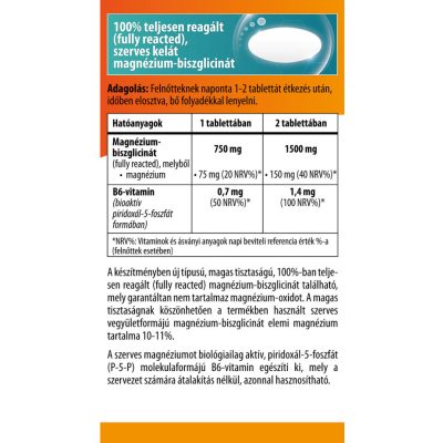 Összetevők: magnézium-biszglicinát (fully reacted/teljesen reagált formában); tömegnövelőszer (mikrokristályos cellulóz); fényező anyagok (zsírsavak); csomósodást gátló anyag(szilícium-dioxid); piridoxál-5-foszfát