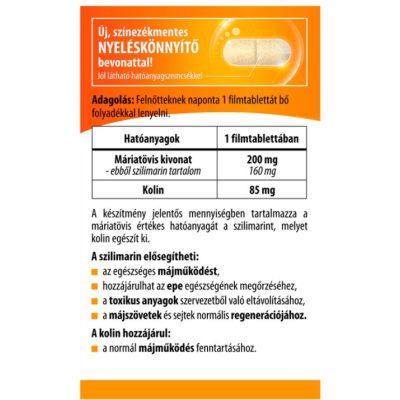Összetevők: tömegnövelő szerek (mikrokristályos cellulóz, dikalcium-foszfát); kolin-bitartarát; máriatövis kivonat (200 mg / filmtabletta); fényező anyagok [zsírsavak, poli(vinil-alkohol)-poli(etilénglikol) ojtott kopolimer, polivinil-alkohol]; csomósodást gátló anyagok (szilícium-
