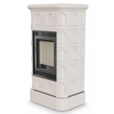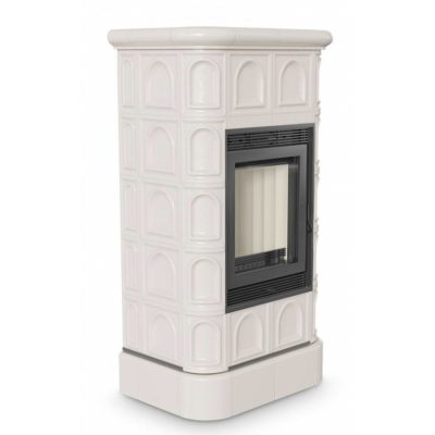 • Ez a kandalló kályha retró stílusban készült, melyet krémszínű, fényes csempékkel borítottak be. A cserépburkolat hosszan megtartja a kibocsátott hőt még a lángok kialvása után is.