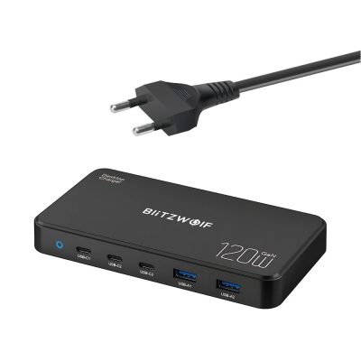 • Blitzwolf® BW-i100 GaN 120W asztali USB gyorstöltő, 5 USB port (3x 100W PD3.0 gyorstöltő + 2x 18w USB-A port)
