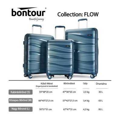 A BONTOUR “Flow” 3 darabos bőrönd szett tökéletes választás, ha minden utazási helyzetre szeretnél felkészülni. A szett tartalmaz egy S (kabinméretű), M (közepes) és L (nagyméretű) gurulós bőröndöt, így legyen szó hétvégi kiruccanásról, 4–7 napos utazásról vagy akár 1–2 hetes nyaralásról, mindig a megfelelő méret áll rendelkezésedre.