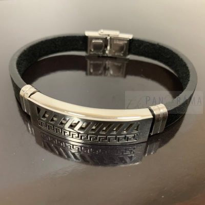 Férfi karkötő acél és préselt bőr kombinációval, ezüst színű előlappal díszítve. Igazán fiatalos, férfias, sportos viselet.