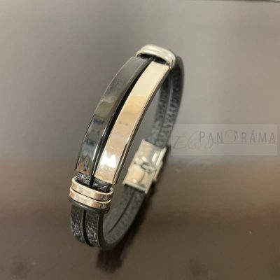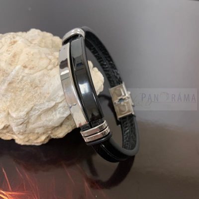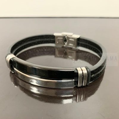 Férfi karkötő acél és bőr kombinációval. Fekete és ezüst színű.
