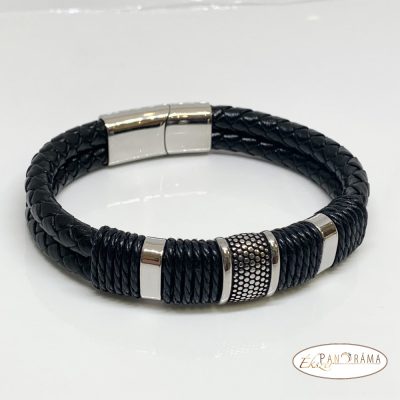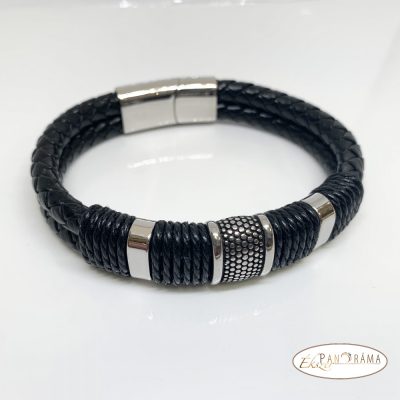 Férfi karkötő nemesacél-bőr kombinációval.