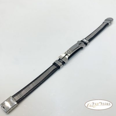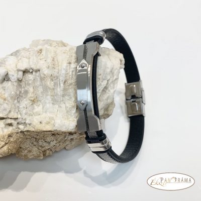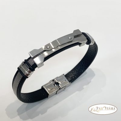 Férfi karkötő nemesacél-bőr kombinációval, ezüst színű előlappal díszítve. Igazán fiatalos, férfias, sportos viselet.