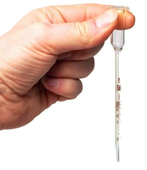 3. Leolvasás: Várjon addig, amíg alul a borfokolóból néhány csepp kifolyik, majd fordítsa fejjel lefelé a fokolót. Helyezze a fokolót a tölcsérrel lefelé egy vízszintes felületre (pl. asztalra). Miután a kapillárisban (a vékony csőben) megállt a folyadék mozgása, a skáláról leolvasható az alkoholtartalom Vol.%-ban.