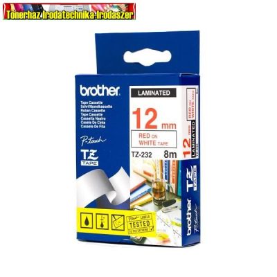 12 mm széles, 8 m hosszú, fehér alapon piros színű tartós laminált feliratokhoz nyomtatószalag