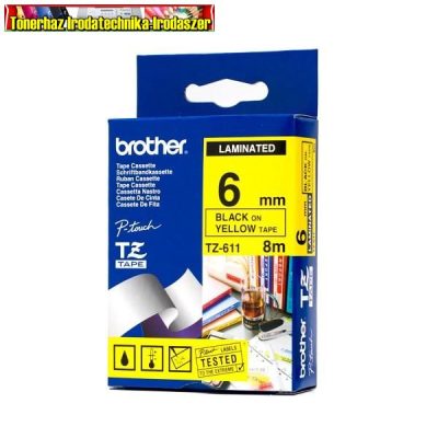 6 mm széles, 8 m hosszú, sárga alapon fekete színű tartós laminált feliratokhoz nyomtatószalag