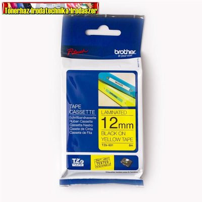 12 mm széles, 8 m hosszú, sárga alapon fekete színű tartós laminált feliratokhoz nyomtatószalag