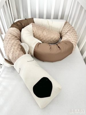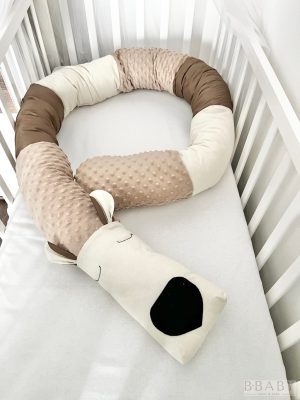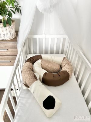 A 200×20 cm-es hosszú hengerpárna formájával tökéletesen alkalmazkodik különféle igényekhez. Kismamáknak kényelmes támasz alváshoz, babáknak biztonságos kuckó a pihenéshez, apukáknak pedig ölelni való alvótárs. A barna dekorvászon és a krém wellsoft bársonyos puhasága kellemes tapintást biztosít, miközben a színei visszafogott, természetes hangulatot varázsolnak a babaszobába.