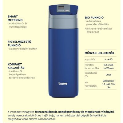 • BWT Perlamat vízlágyító minden regenerálási folyamat alatt (a vízlágyító által megkötött vízkeménységet okozó anyagok eltávolítási folyamata alatt) fertőtleníti az ioncserélő gyantát, ami az Ön otthona higiéniáját biztosítja