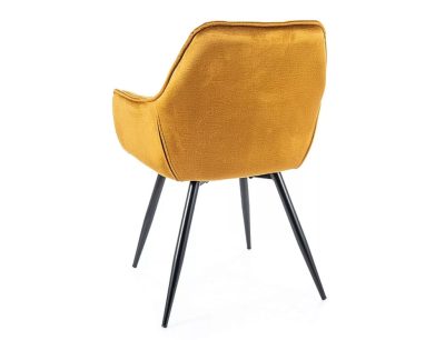 A Cherry Monolith étkezőszék a modern design és a kényelem tökéletes ötvözete. A curry színű, vízlepergető bársony kárpitozás és a fekete matt fém lábak elegáns kontrasztot alkotnak. A szék különleges, rombusz mintázatú steppelt háttámlája és ülőfelülete nem csak esztétikus, de rendkívül kényelmes is. A karfás kialakítás további komfortot biztosít, míg a kompakt méretei ideálissá teszik kisebb terekbe is.