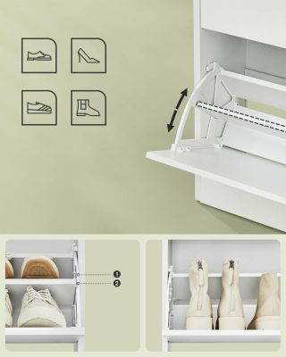 • Alkalmazható és helytakarékos: A kivehető elválasztókkal és 2 elválasztóval állítható szinttel ez a cipős szekrény sokféle cipőhöz illeszkedik. Állítsa be, kapcsolja át, és optimalizálja a teret saját igényei szerint