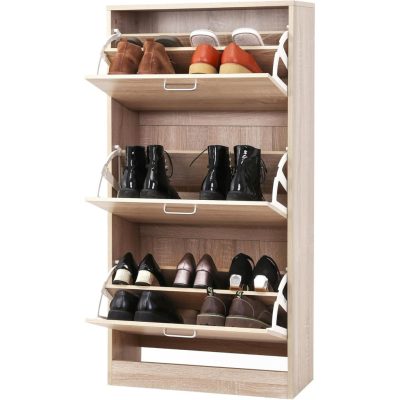 3 szintes cipős szekrény, cipőtároló szekrény, állítható cipőtartó, kihajtható ajtókkal, 60 x 24 x 120 cm (h x sz x ma), tölgy szín