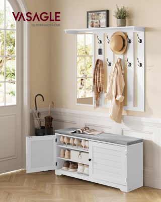 • RENGETEG TÁROLÓHELYFalra szerelhető kabátakasztó, 8 dupla akasztóval és 1 polccal, cipőszekrény 2 állítható polccal és nagy ülőfelülettel - ez a kabátakasztó és cipőpad kombináció bőséges helyet biztosít ruháidnak, cipőidnek és egyéb tárgyaidnak.