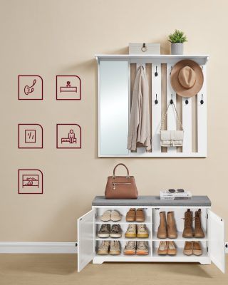 • KÖNNYŰ ÖSSZESZERELÉSAz egyértelmű utasításoknak és a megjelölt alkatrészeknek köszönhetően ez a tükörrel ellátott pad és kabátakasztó pillanatok alatt összeszerelhető, így időt és energiát takaríthatsz meg.