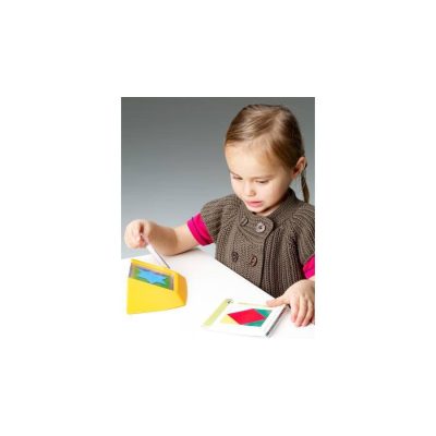 Nem mindegy a sorrend, trükkösen takard el a formákat, hogy egészen más ábrát kapj, ami a feladatlapon szerepel. Hány lapka kell hozzá? 2 vagy három, vagy esetleg négy? Ezt is ki kell találnod!